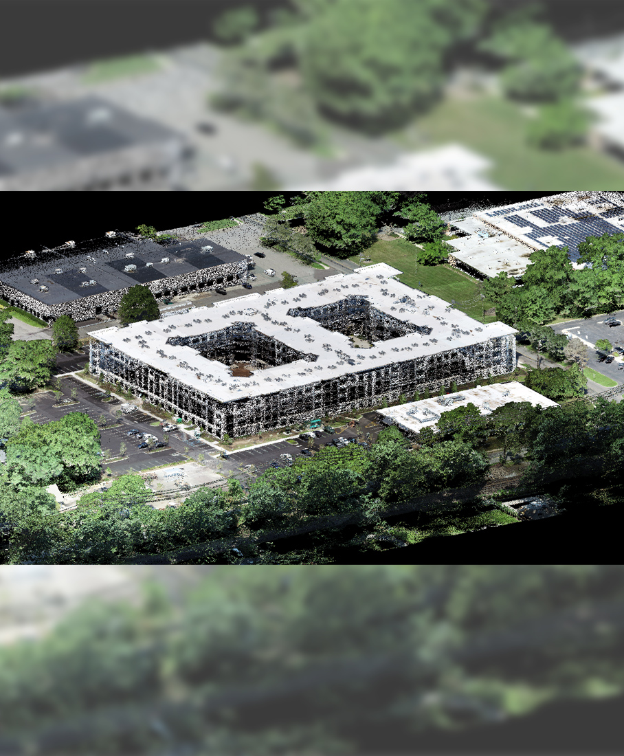 The output involves extracting points from the cloud, drafting 2D CAD features in .dwg format, mapping utilities for both ground and underground surfaces, providing topography and spot elevation labels, showing surface grades and contour grades, including pipe invert data, detailing boundary information, and supplying property details including lot, block, city, county, and state.
